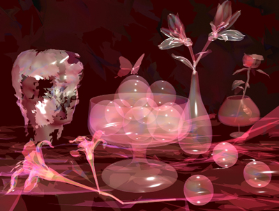"Crystal Clear"A special function was used to make objects look like glass. I had to play back and forth with different settings for the transparency. Many of the spheres inside the bowl intersect but I think it makes it more interesting. All of the models were mathematically generated using functions that affect geometry. The head data was scanned by a laser beam and automatically recorded into the computer.