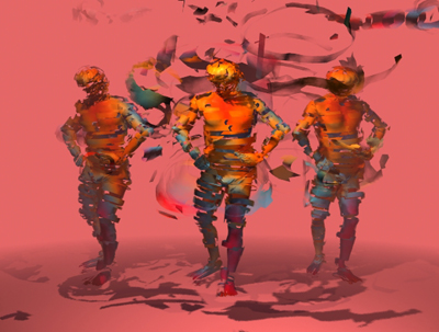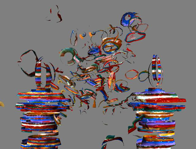 "Gossip"A function for fragmentation was used to break the figure into pieces. It has the capability to make clusters of fragments, control their range of displacement and to rotate them. The center section is the same as the figures on the sides but with a greater displacement. I made a painting of just stripes. My painting was scanned and then I mapped it onto the 3d models.