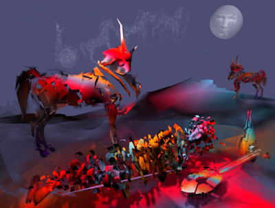 "Sleeping Gypsy"I have always loved the Sleeping Gypsy by Henri Rousseau in the Museum of Modern Art. I first posed the figure and then I used the fragmentation function. In the sky the horses were also fragmented in several steps. I used a face and combined it with a sphere to make the moon.