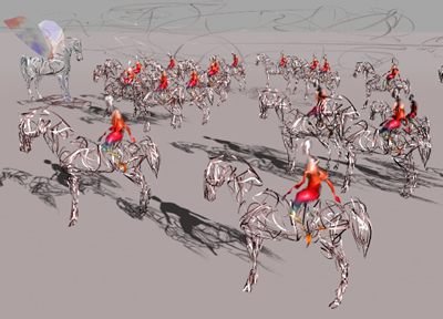 "The Past Casts Shadows"I used a function which makes copies of the same horse and rider model. They were randomly placed onto the plane inside a box. The box can be scaled and shifted. I struggled a long time to place the spotlights which cast the shadows.