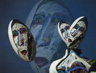 "Mask of Fear"I created the painting of a mask-like face with my old oil paints and brushes. In part I reveal my love for expressionism. The texture map of the painting on different surfaces and at varied sizes seems to extend my original painting. The notion of copies of the same object with transformations in the world space has been with me since the early 1960's.