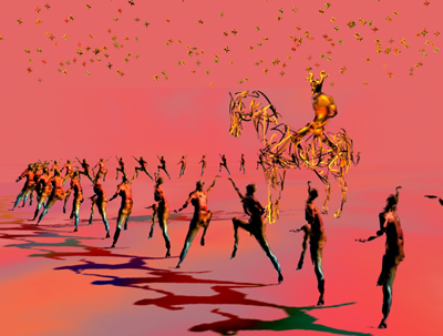 "Where do we Look, 1997"Besides the head, the scene has only two basic figures. I made copies of each of them and there are 2050 figures in the scene. Their representations are at different levels of detail. A decimate function reduced the polygon count and yet preserved the basic geometry of the figure. The lighting was especially difficult to set because there was so much data.